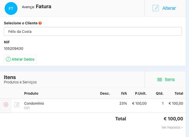 Caso queira eliminar uma Avença que já tenha emitido documentos, vá a Gestão > Documentos > Avenças e clique na Avença desejada. Verá a opção Alterar - clique.
