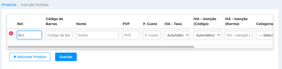 Basta preencher os dados pedidos. Se quiser ir adicionando produtos, vá clicando em Adicionar Produto. Para finalizar a inserção, clique em Guardar.