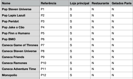 Na coluna da Loja, deve colocar o nome exacto da loja, tal como está configurada no Vendus. Esta coluna deverá ser preenchida do seguinte modo: