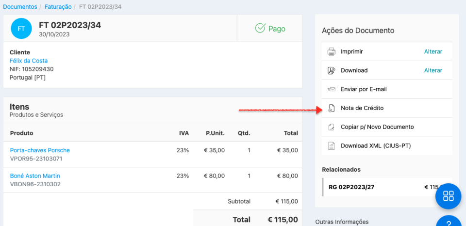 • No campo Ações do Documento (lado direito), clique em Nota de Crédito.