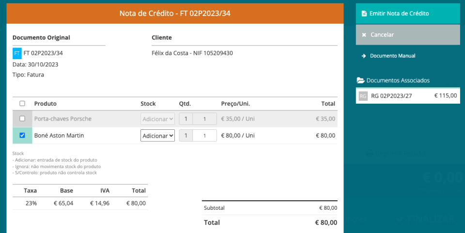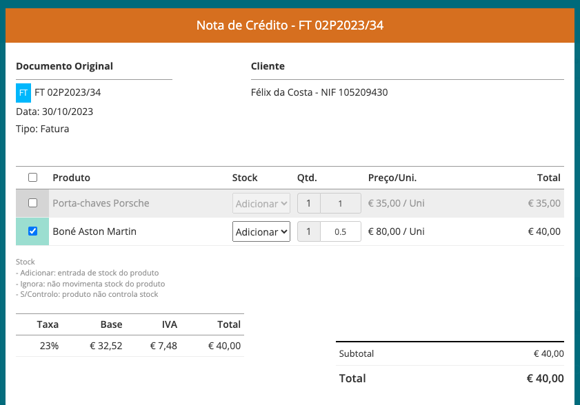 Por vezes, pode não querer fazer a Nota de Crédito total e querer apenas devolver o valor relativo a um produto ou a uma parte do produto.