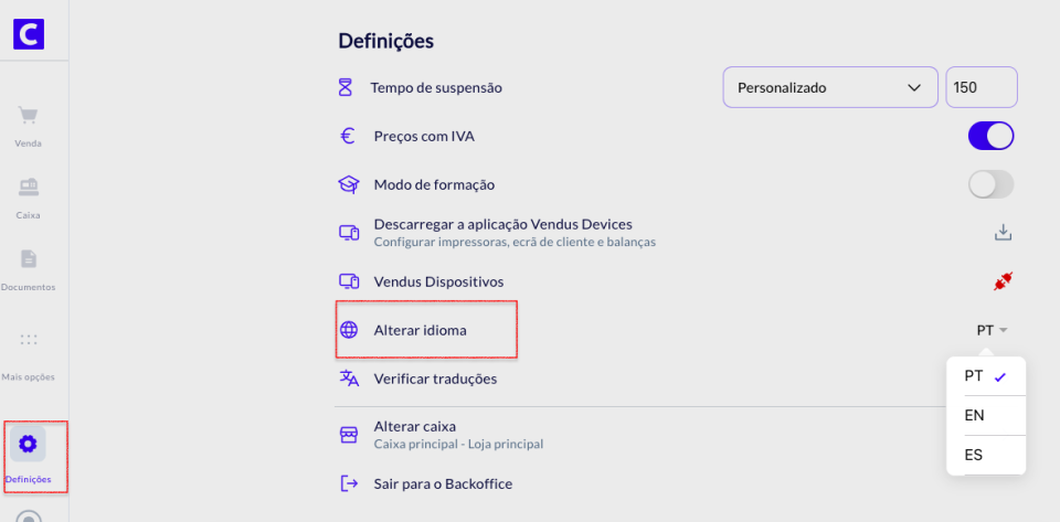 Para alterar o idioma directamente no POS, basta clicar em Definições, do lado direito. No menu, verá a opção.